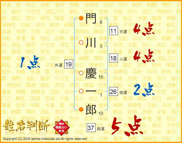 門(8画)川(3画) 慶(15画)一(1画)郎(10画)