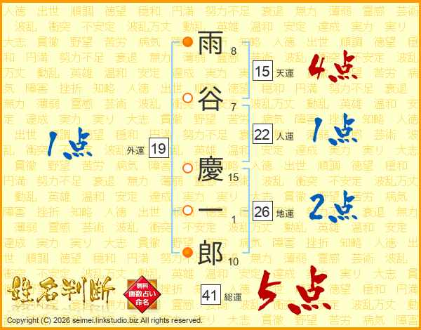 雨(8画)谷(7画) 慶(15画)一(1画)郎(10画)