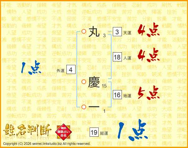 生活面を象徴する運勢です。外部から受ける影響力を表し、結婚運、家庭運や職場、環境への順応性を表します。総運から人運を引いた画数。姓や名が1文字の場合を除く。