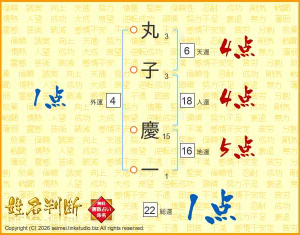 生活面を象徴する運勢です。外部から受ける影響力を表し、結婚運、家庭運や職場、環境への順応性を表します。総運から人運を引いた画数。姓や名が1文字の場合を除く。