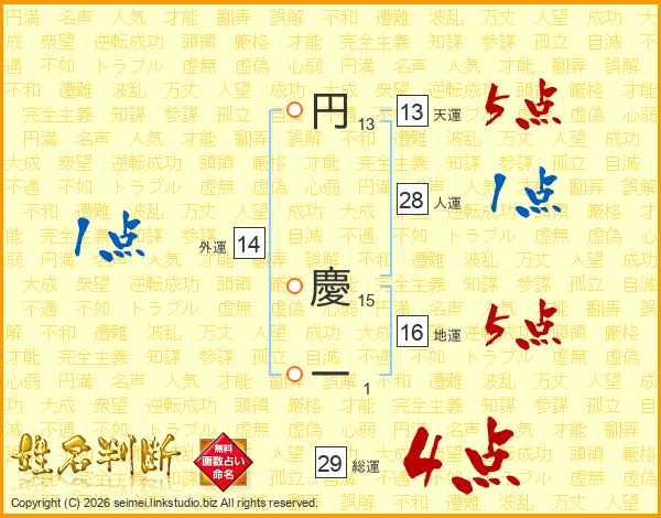 生活面を象徴する運勢です。外部から受ける影響力を表し、結婚運、家庭運や職場、環境への順応性を表します。総運から人運を引いた画数。姓や名が1文字の場合を除く。