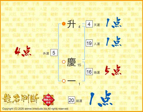 生活面を象徴する運勢です。外部から受ける影響力を表し、結婚運、家庭運や職場、環境への順応性を表します。総運から人運を引いた画数。姓や名が1文字の場合を除く。