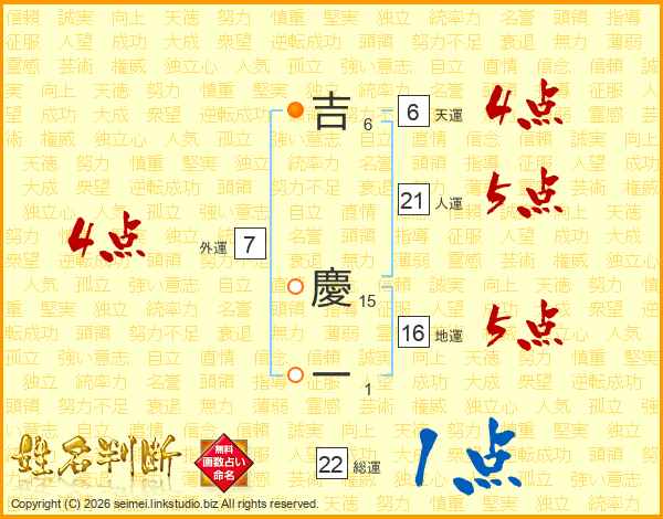 生活面を象徴する運勢です。外部から受ける影響力を表し、結婚運、家庭運や職場、環境への順応性を表します。総運から人運を引いた画数。姓や名が1文字の場合を除く。