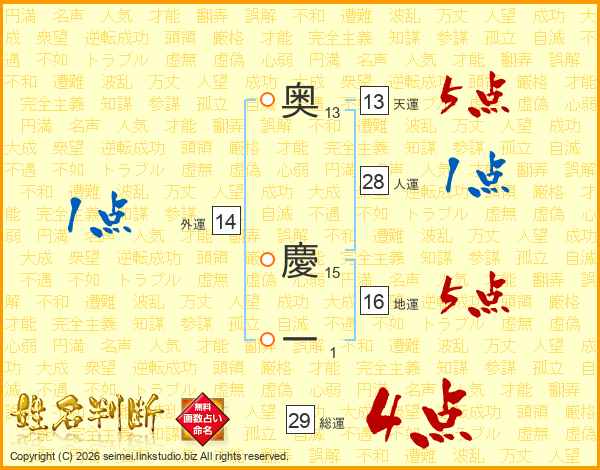 生活面を象徴する運勢です。外部から受ける影響力を表し、結婚運、家庭運や職場、環境への順応性を表します。総運から人運を引いた画数。姓や名が1文字の場合を除く。