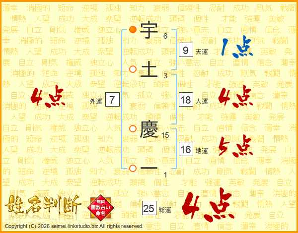 生活面を象徴する運勢です。外部から受ける影響力を表し、結婚運、家庭運や職場、環境への順応性を表します。総運から人運を引いた画数。姓や名が1文字の場合を除く。