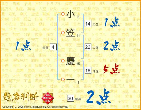 生活面を象徴する運勢です。外部から受ける影響力を表し、結婚運、家庭運や職場、環境への順応性を表します。総運から人運を引いた画数。姓や名が1文字の場合を除く。