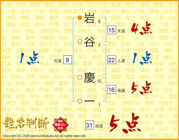 岩(8画)谷(7画) 慶(15画)一(1画)
