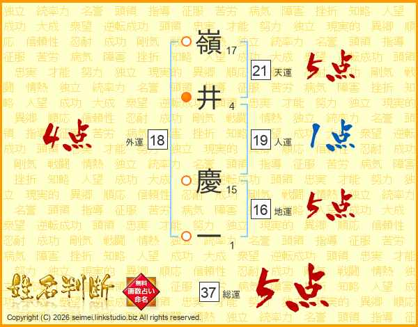 嶺(17画)井(4画) 慶(15画)一(1画)