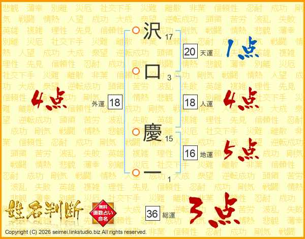 生活面を象徴する運勢です。外部から受ける影響力を表し、結婚運、家庭運や職場、環境への順応性を表します。総運から人運を引いた画数。姓や名が1文字の場合を除く。