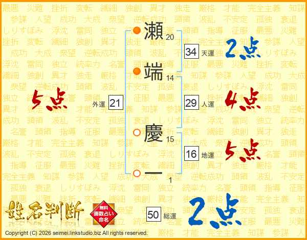 瀬(20画)端(14画) 慶(15画)一(1画)
