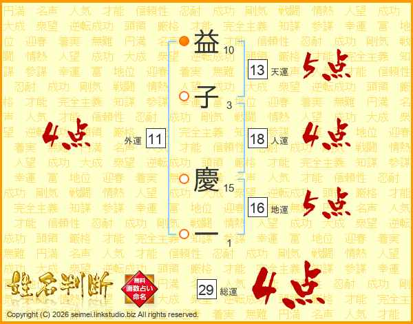 あなたの人生を表す1番重要な運勢です。生涯を通じて影響する総合運となり、主に50歳以降の晩年期に影響を及ぼします。苗字と名前の合計画数。