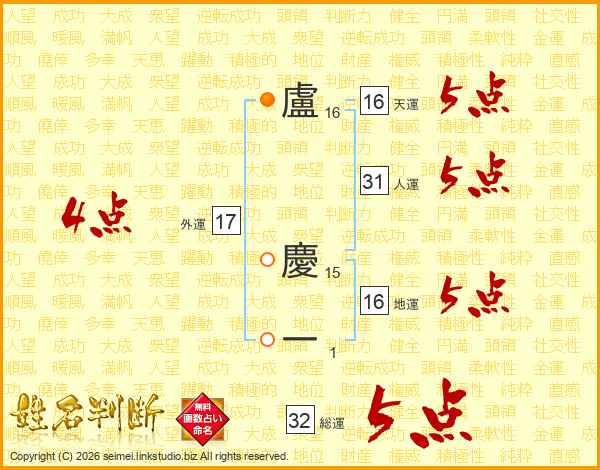 盧慶一さんの総運は32画の5点!