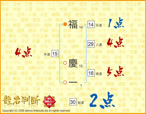 生活面を象徴する運勢です。外部から受ける影響力を表し、結婚運、家庭運や職場、環境への順応性を表します。総運から人運を引いた画数。姓や名が1文字の場合を除く。