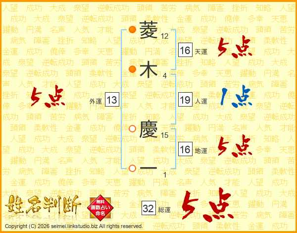生活面を象徴する運勢です。外部から受ける影響力を表し、結婚運、家庭運や職場、環境への順応性を表します。総運から人運を引いた画数。姓や名が1文字の場合を除く。