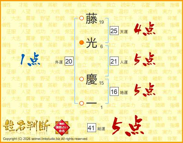 家系が持つ宿命的な運勢を表します。祖先から受け継いだ苗字ですので自分の力が及びません。家柄を象徴します。苗字の合計画数。