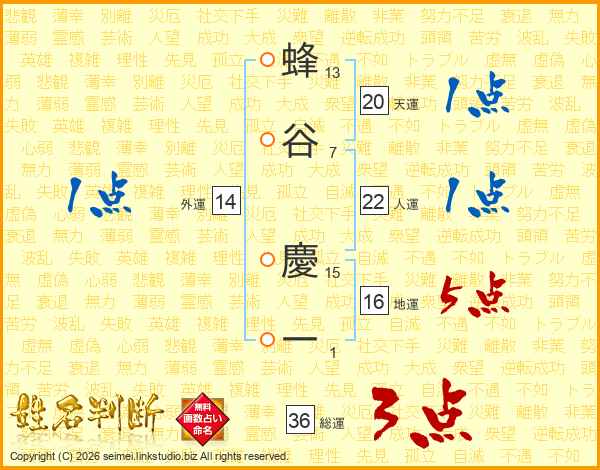 蜂(13画)谷(7画) 慶(15画)一(1画)