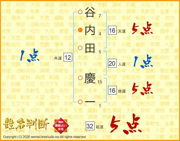 谷(7画)内(4画)田(5画) 慶(15画)一(1画)