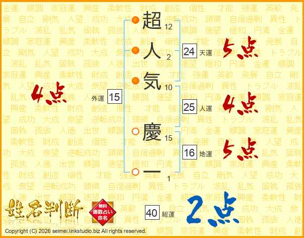 超(12画)人(2画)気(10画) 慶(15画)一(1画)