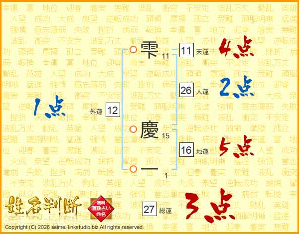 生活面を象徴する運勢です。外部から受ける影響力を表し、結婚運、家庭運や職場、環境への順応性を表します。総運から人運を引いた画数。姓や名が1文字の場合を除く。