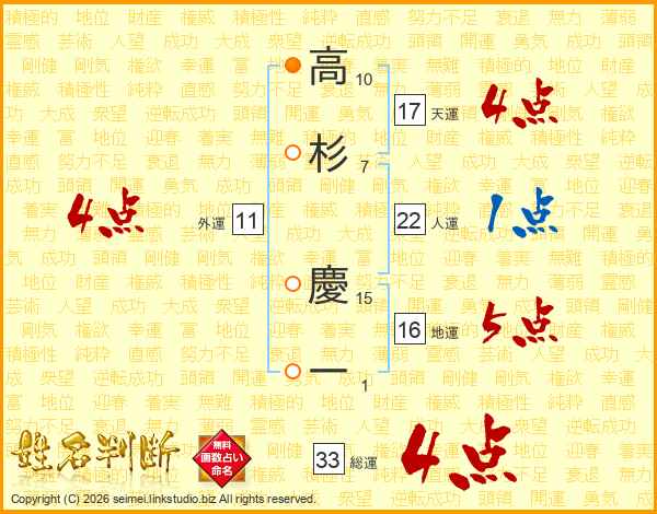 高杉慶一さんの総運は33画の4点!