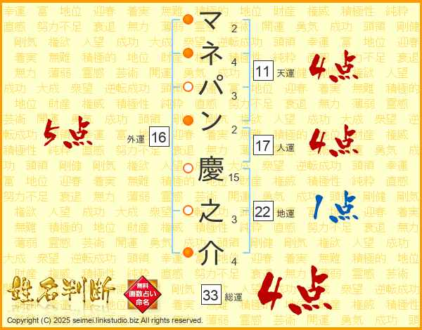 マ(2画)ネ(4画)パ(3画)ン(2画) 慶(15画)之(3画)介(4画)