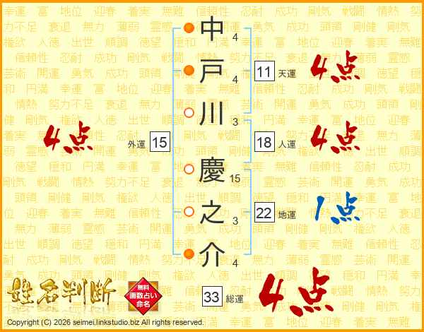 中(4画)戸(4画)川(3画) 慶(15画)之(3画)介(4画)