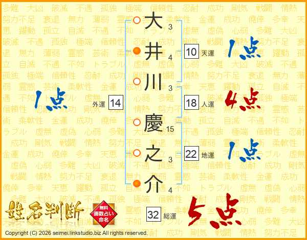 大井川慶之介さんの総運は32画の5点!