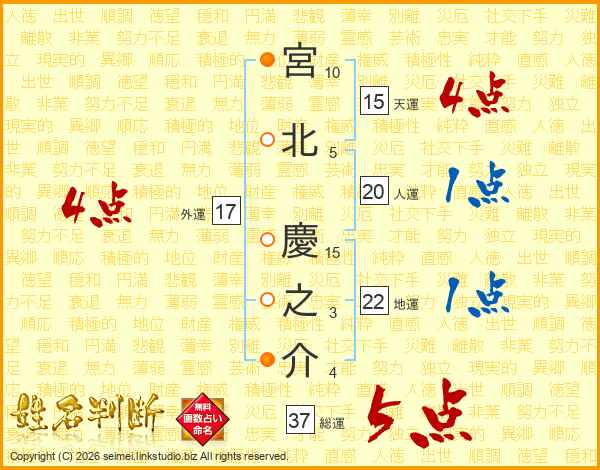 宮(10画)北(5画) 慶(15画)之(3画)介(4画)