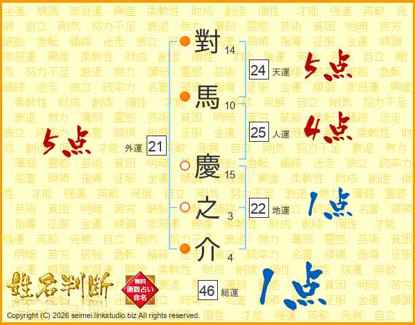 對(14画)馬(10画) 慶(15画)之(3画)介(4画)
