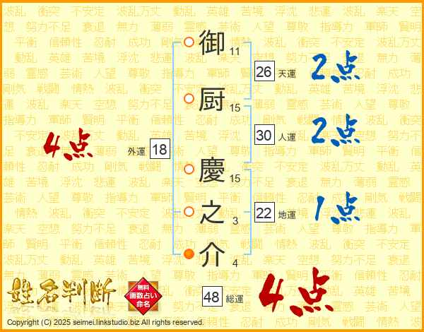 御(11画)厨(15画) 慶(15画)之(3画)介(4画)