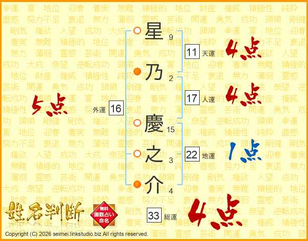 星(9画)乃(2画) 慶(15画)之(3画)介(4画)