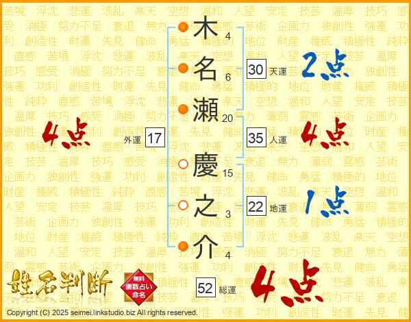 木(4画)名(6画)瀬(20画) 慶(15画)之(3画)介(4画)