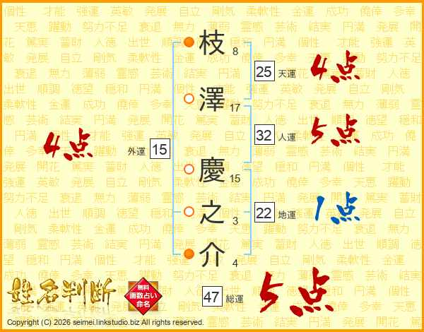 枝(8画)澤(17画) 慶(15画)之(3画)介(4画)