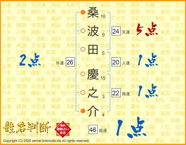 桑(10画)波(9画)田(5画) 慶(15画)之(3画)介(4画)