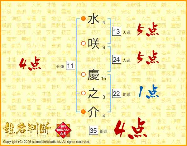 水(4画)咲(9画) 慶(15画)之(3画)介(4画)