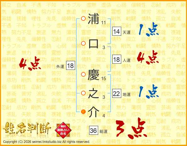 浦(11画)口(3画) 慶(15画)之(3画)介(4画)