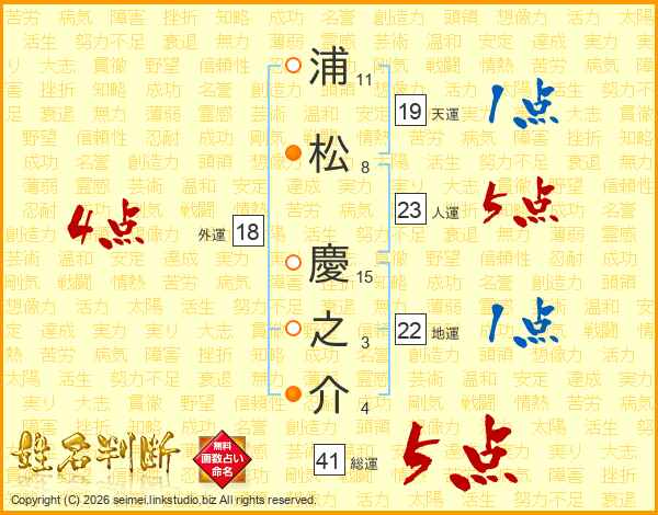浦(11画)松(8画) 慶(15画)之(3画)介(4画)