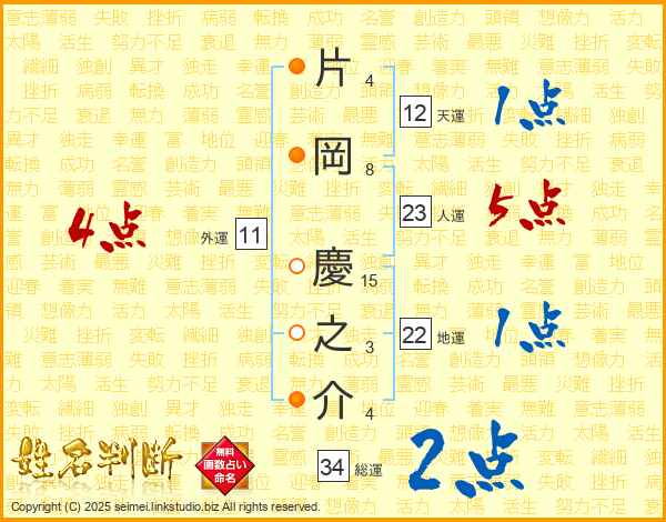 片(4画)岡(8画) 慶(15画)之(3画)介(4画)
