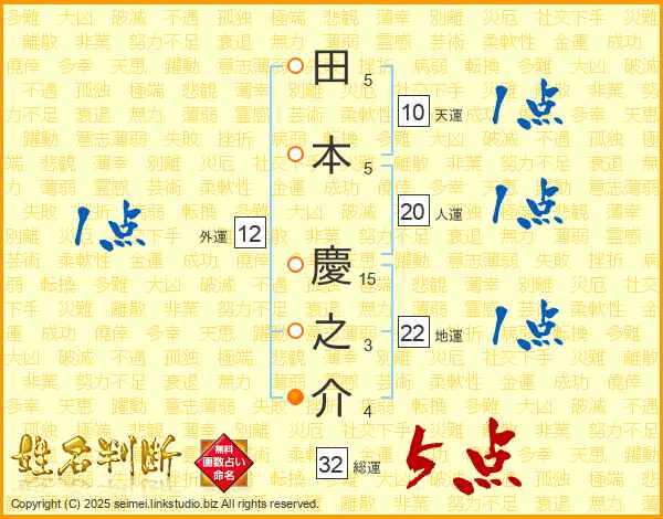 田(5画)本(5画) 慶(15画)之(3画)介(4画)
