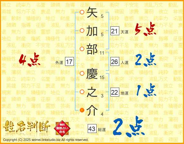 生活面を象徴する運勢です。外部から受ける影響力を表し、結婚運、家庭運や職場、環境への順応性を表します。総運から人運を引いた画数。姓や名が1文字の場合を除く。