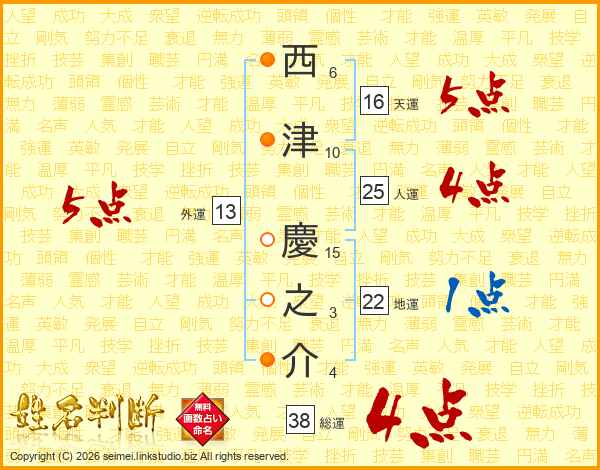 西津慶之介さんの総運は38画の4点!