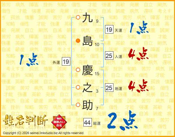 九(9画)島(10画) 慶(15画)之(3画)助(7画)
