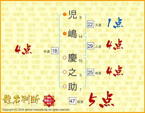 児(8画)嶋(14画) 慶(15画)之(3画)助(7画)