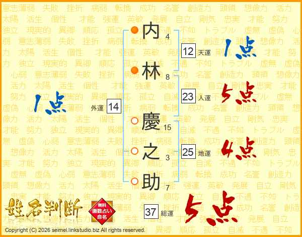 内(4画)林(8画) 慶(15画)之(3画)助(7画)