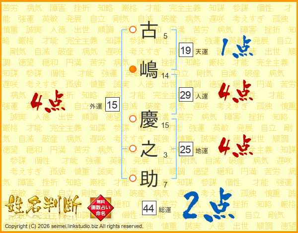 古(5画)嶋(14画) 慶(15画)之(3画)助(7画)