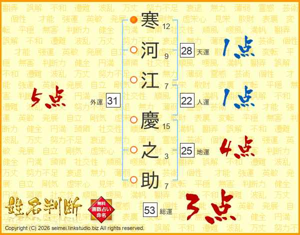 寒(12画)河(9画)江(7画) 慶(15画)之(3画)助(7画)