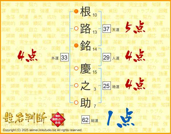 根(10画)路(13画)銘(14画) 慶(15画)之(3画)助(7画)