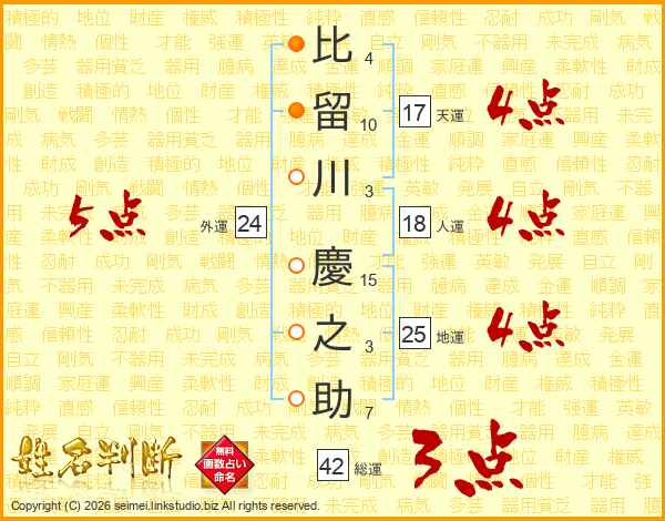 比(4画)留(10画)川(3画) 慶(15画)之(3画)助(7画)