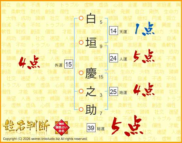白垣慶之助さんの総運は39画の5点!