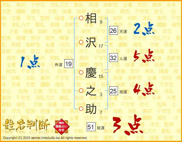 相(9画)沢(17画) 慶(15画)之(3画)助(7画)